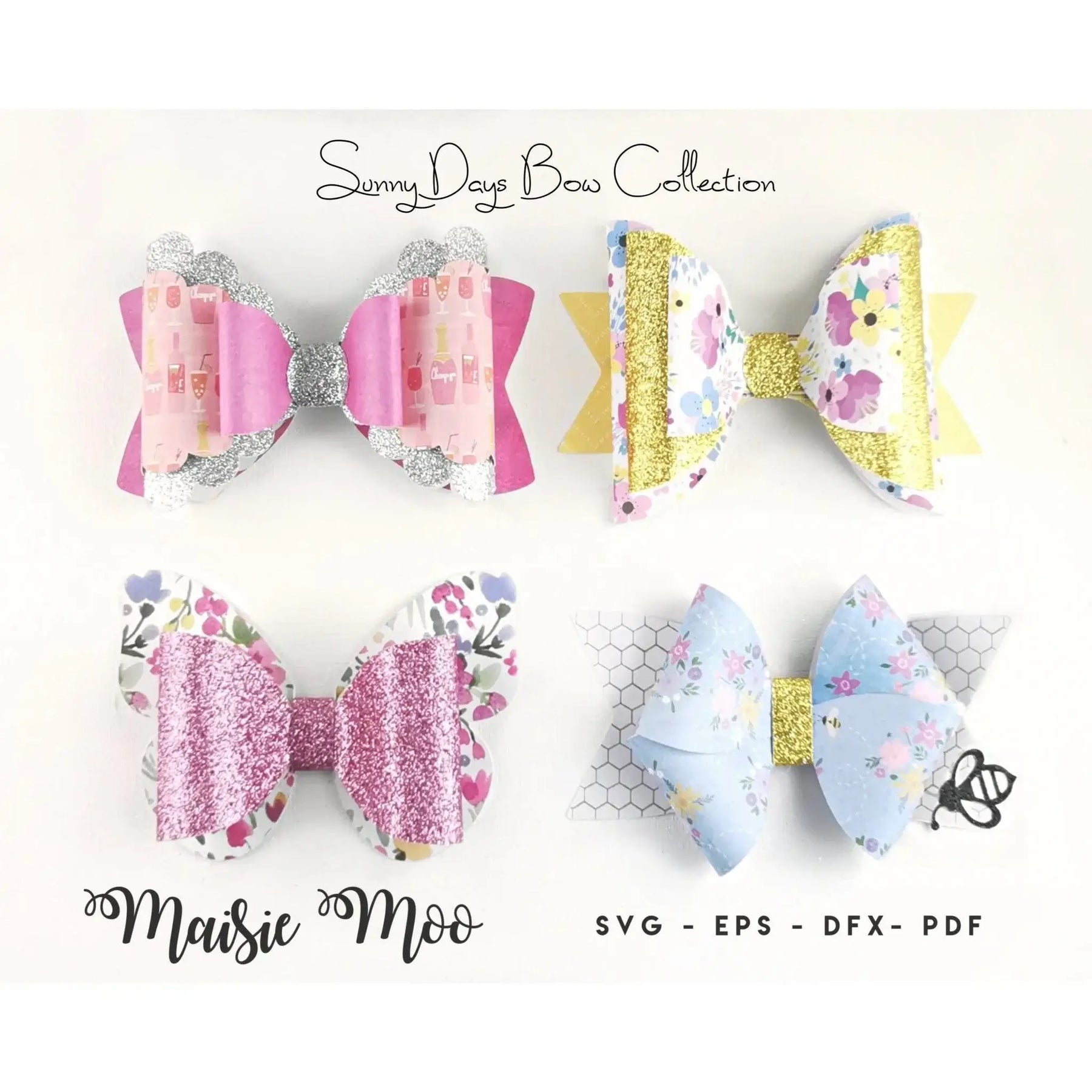 Honey Bee Bow - This delightful bow captures the essence of summer, the main body is made from a pinwheel bow on a large tail, finished off with buzzy glittery bees. This lovely bow can be made in felt, paper, felt backed fabric, faux leather, glitter canvas whatever you choose it is sure to look fab!