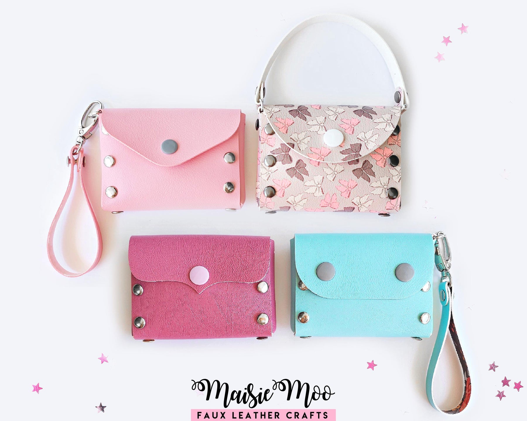 Rivet Purse in pink and floral designs showcasing versatile styles and tab options for a faux leather craft.