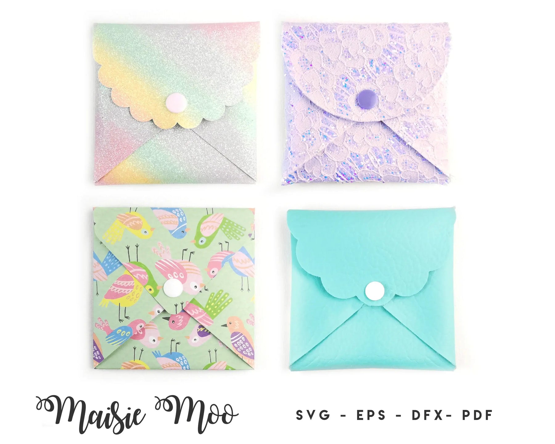 Four designs included, the classic Envelope, pretty Small Scallop, Large Scallop and simple Curved. Can be used for face mask pouches, coin purses, card wallets, pills pouch. Now sewing required, simply attach your snaps or insert your rivet stud.