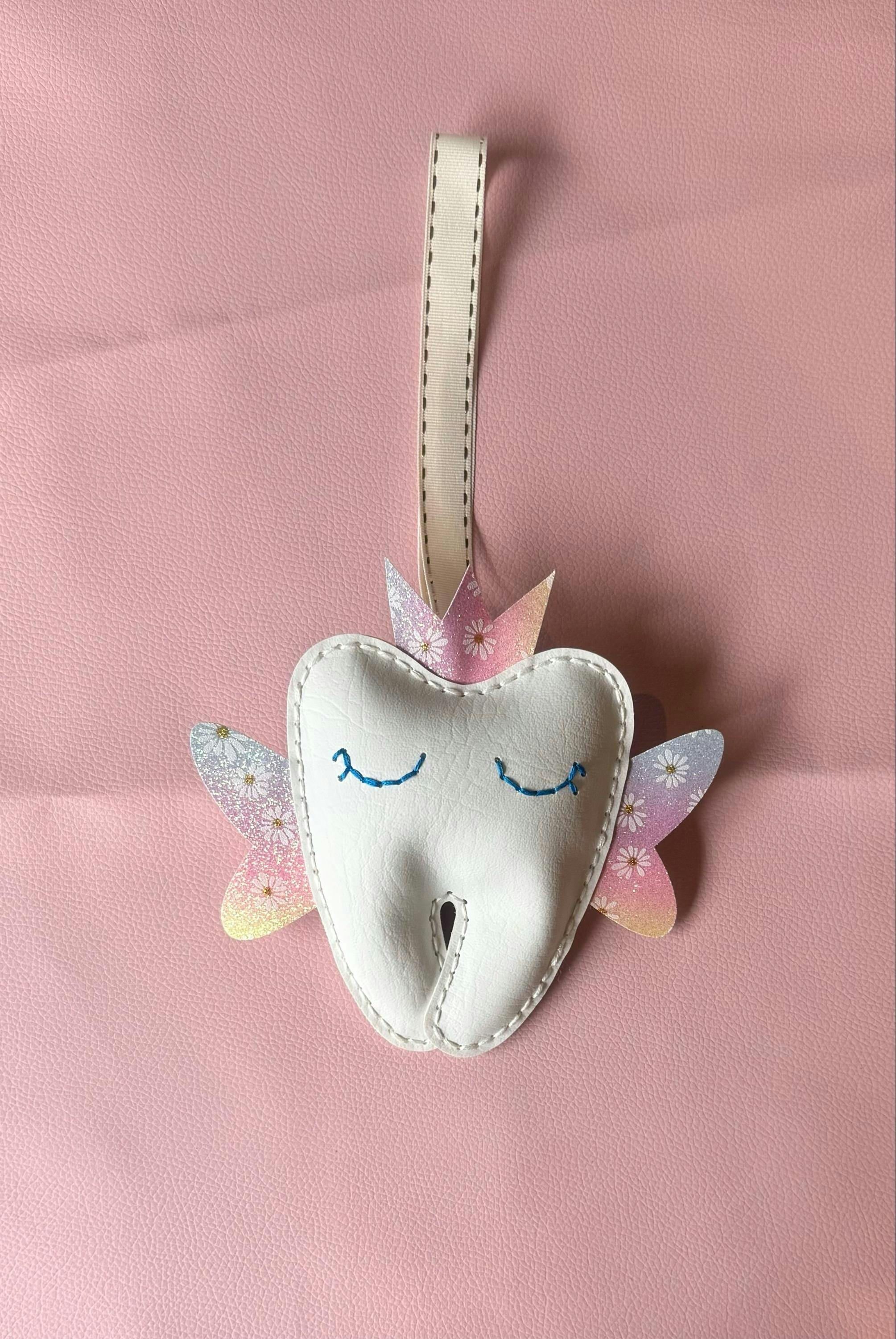 How sweet is this Tooth Fairy Pouch!! It is the newest edition to the 'Easy Stitch' range by Maisie Moo. It is uniquely designed with precut holes, to be cut from faux leather and be hand stitched together. All you need is a needle, some embroidery thread and a bit of stuffing (optional).