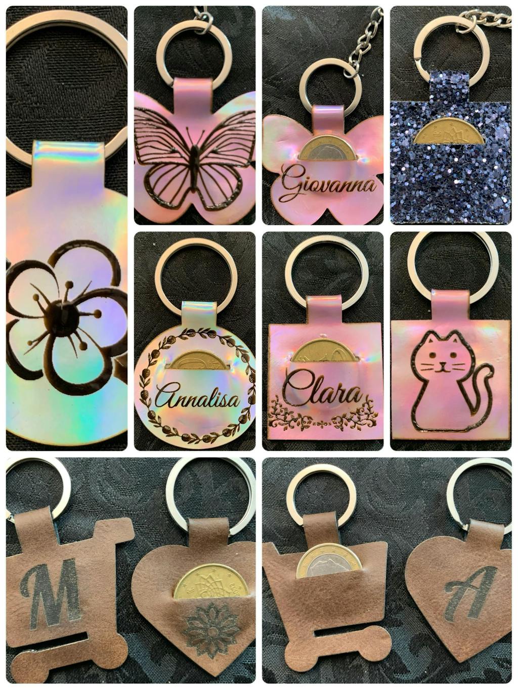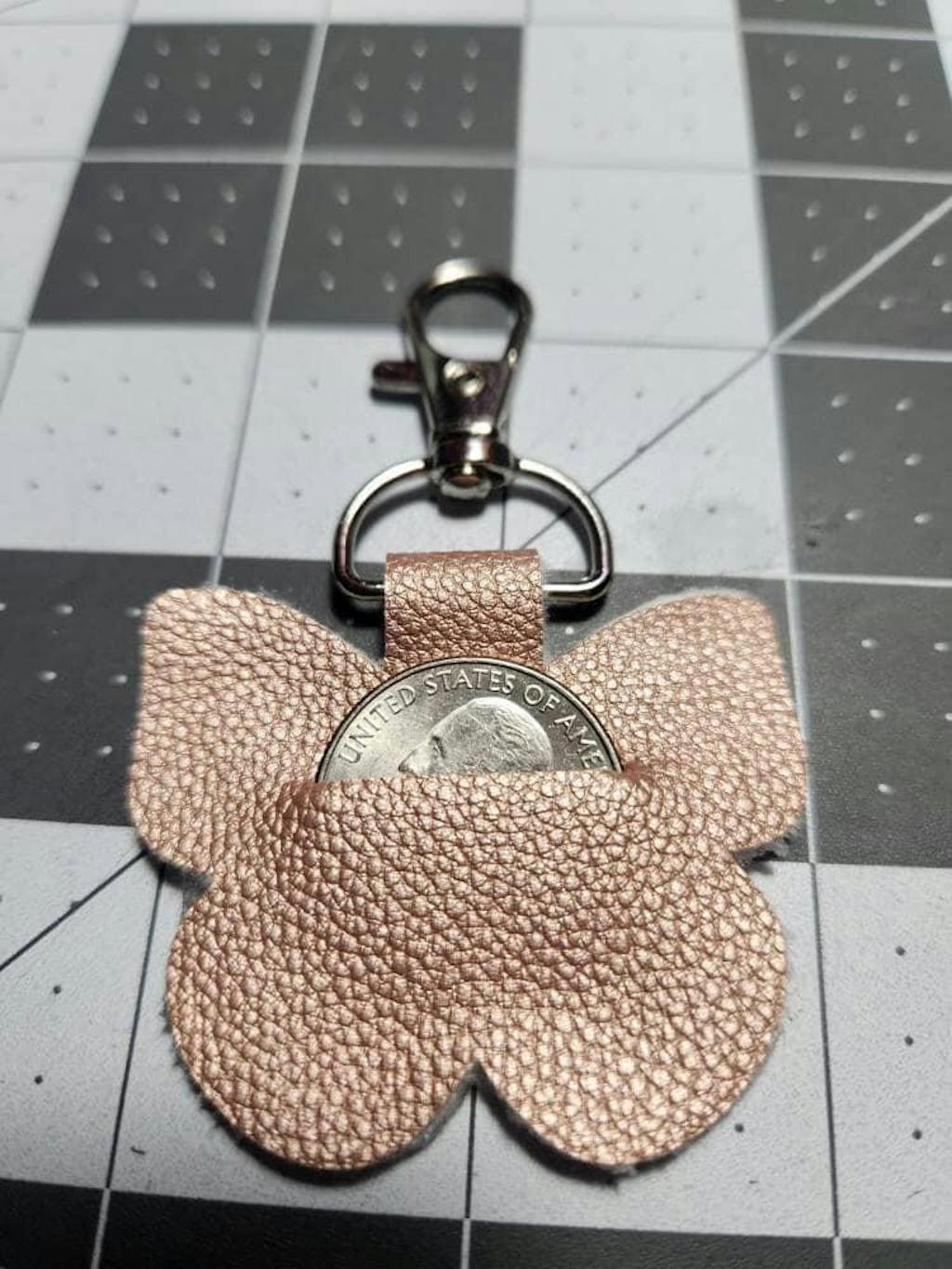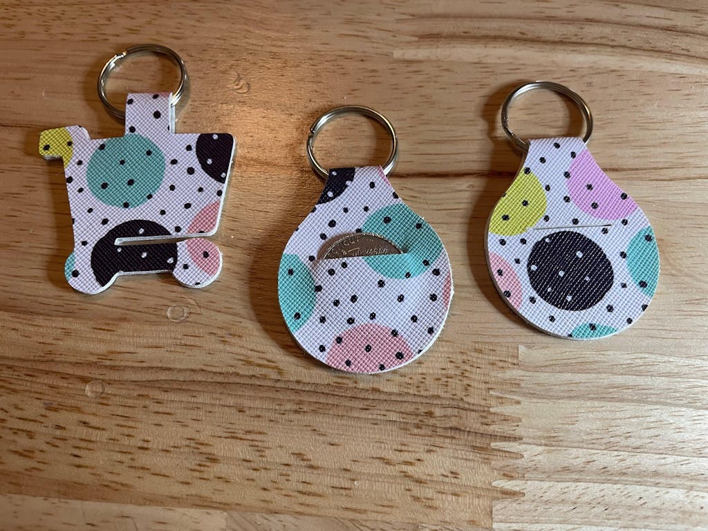 Eight fun designs included. Simply attach your fob hardware, fold and glue. I include two sets of templates, one with pre-cut holes to fit a Quarter and one set with no holes for different sized coins or tokens.