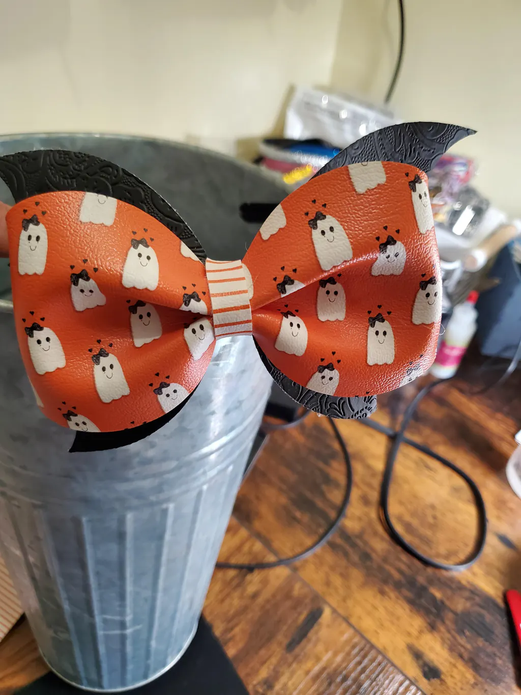 This elegant bow is perfect for Halloween and bat fans too. It is a double layered bow with a plump pinch bow sitting on top of a bat wing tail.