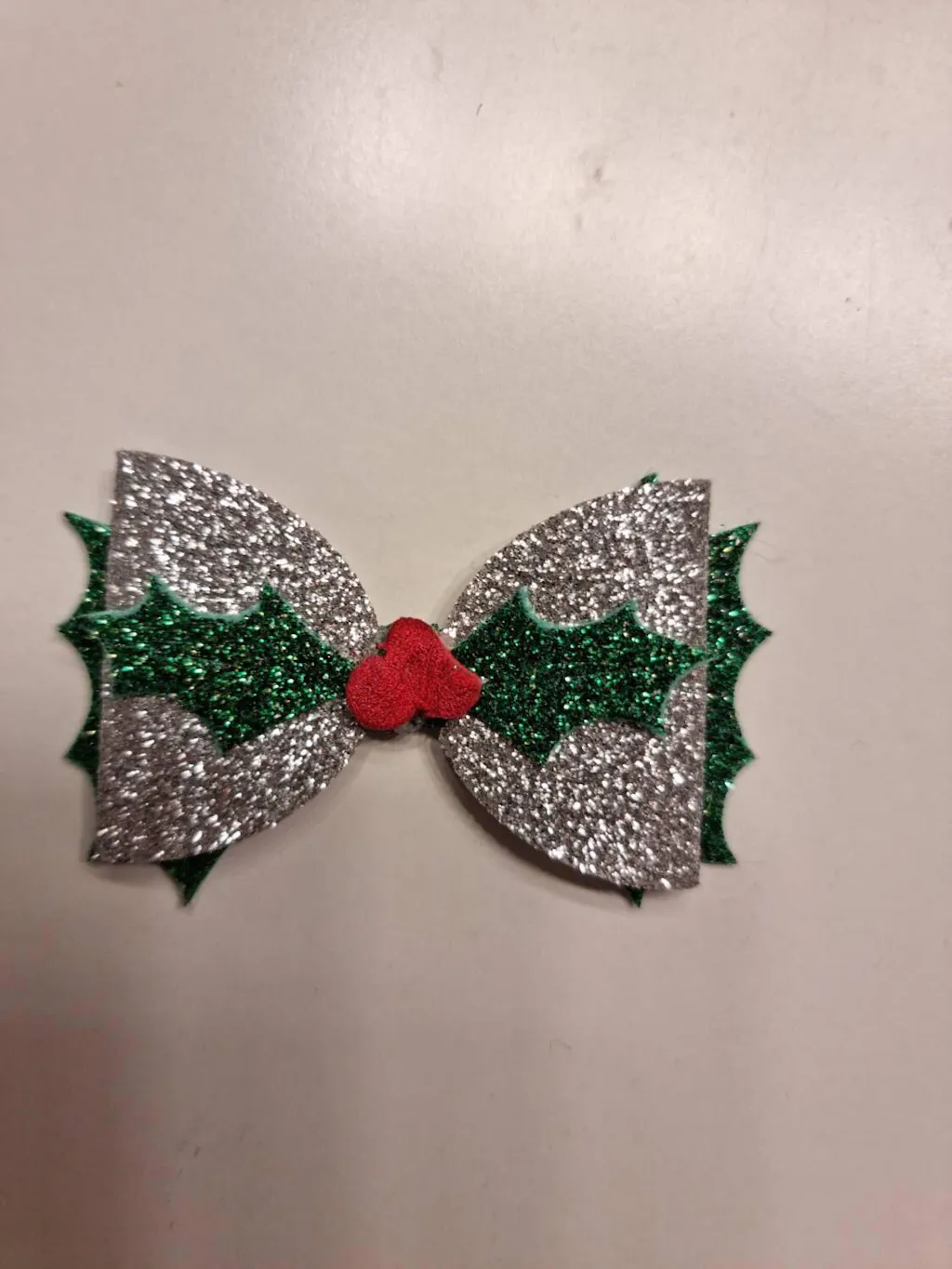 Holly Bow - This festive Christmas Hair Bow is a simple classic. Made from a plump main bow over a Holly leaf shaped tail, finished off with a holly leave overlay and three connected red berries. This bow is part of the Classic Christmas Collection shown in picture 2.