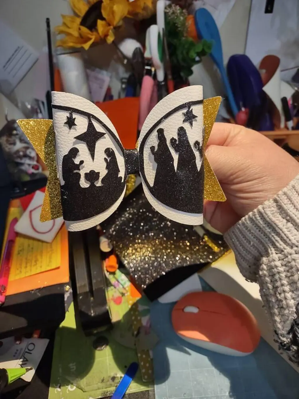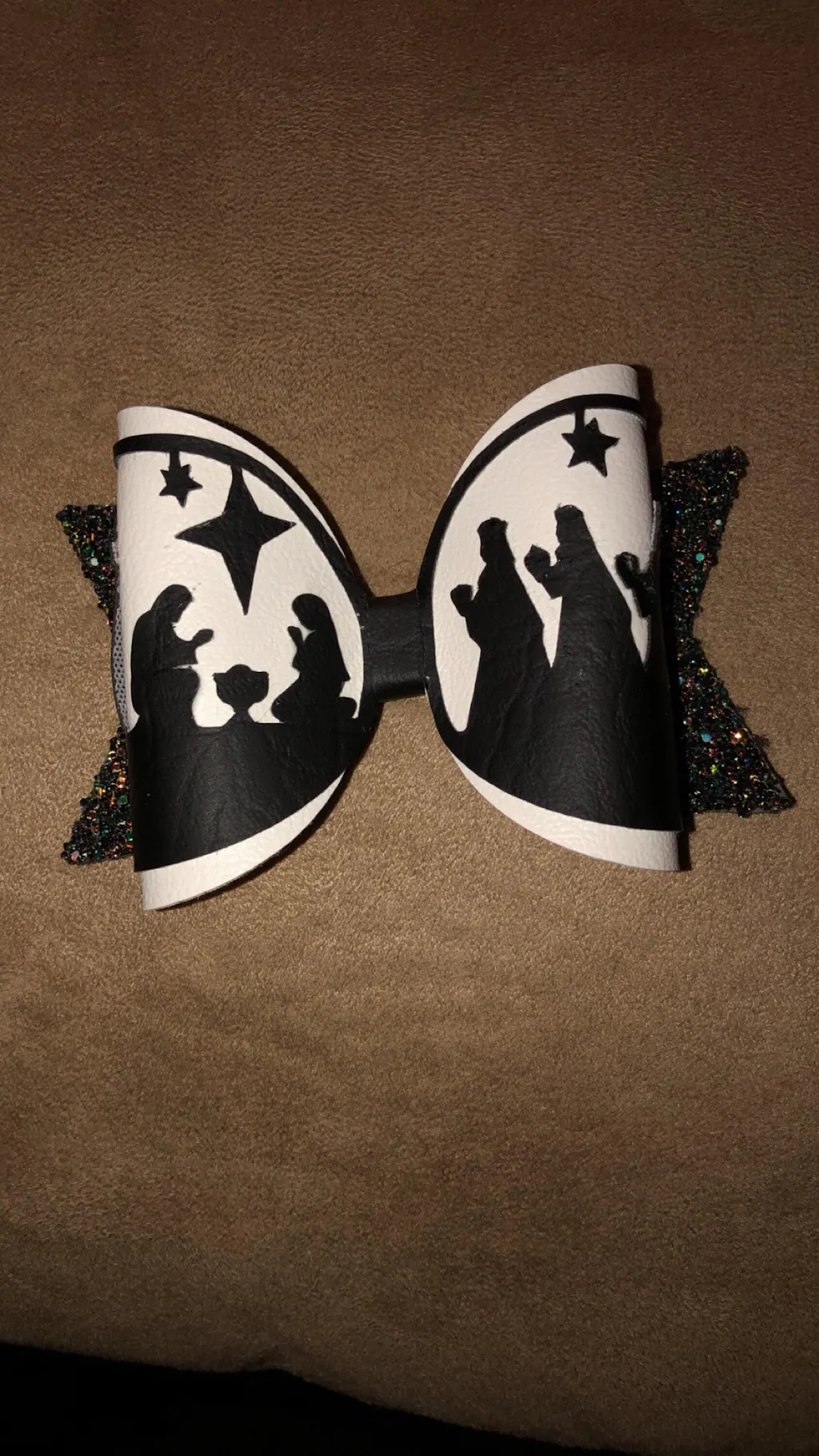 This bow is very cute and perfect for Advent and Christmas. I cut the black design from HTV to be sure the detail would cut perfectly. I was nervous because this is the first bow I’ve made, but I am experienced with faux leather and HTV. It went very well. It would look better if I had used smooth white faux leather, but I don’t have any. The black design does not fit the white portion perfectly, but it all works. I just cut off the extra black parts.