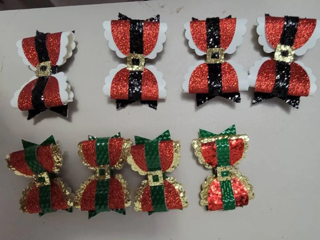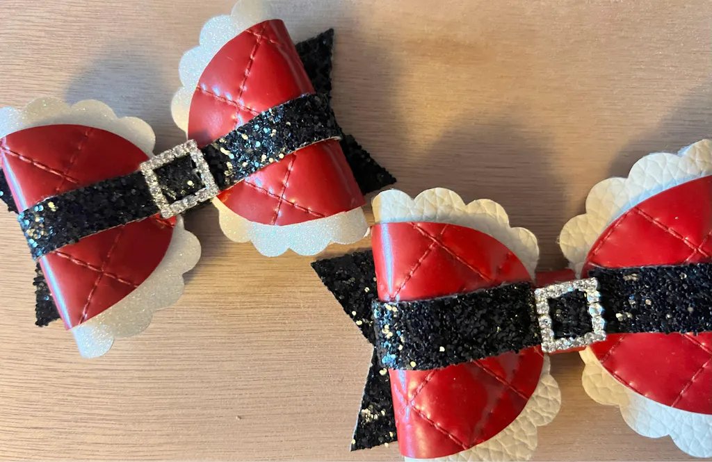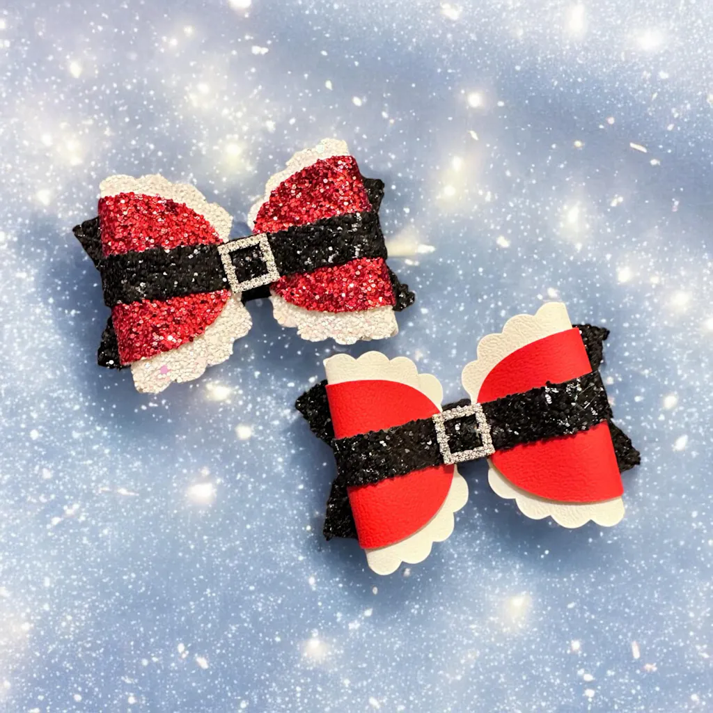 Mrs Claus Buckle Bow - This pretty scalloped bow has a classic shape in festive colors. Use the buckle shape provided or as a sparkly rhinestone buckle.