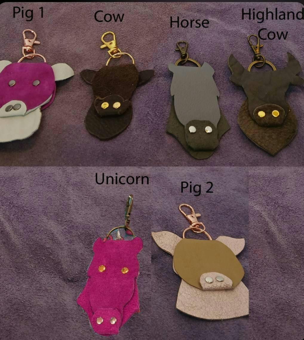 Create these fun farm animal folded key fobs from real leather, faux leather even glitter canvas. You simply cut, insert your split ring, fold and then attach your rivets to hold together, easy!!