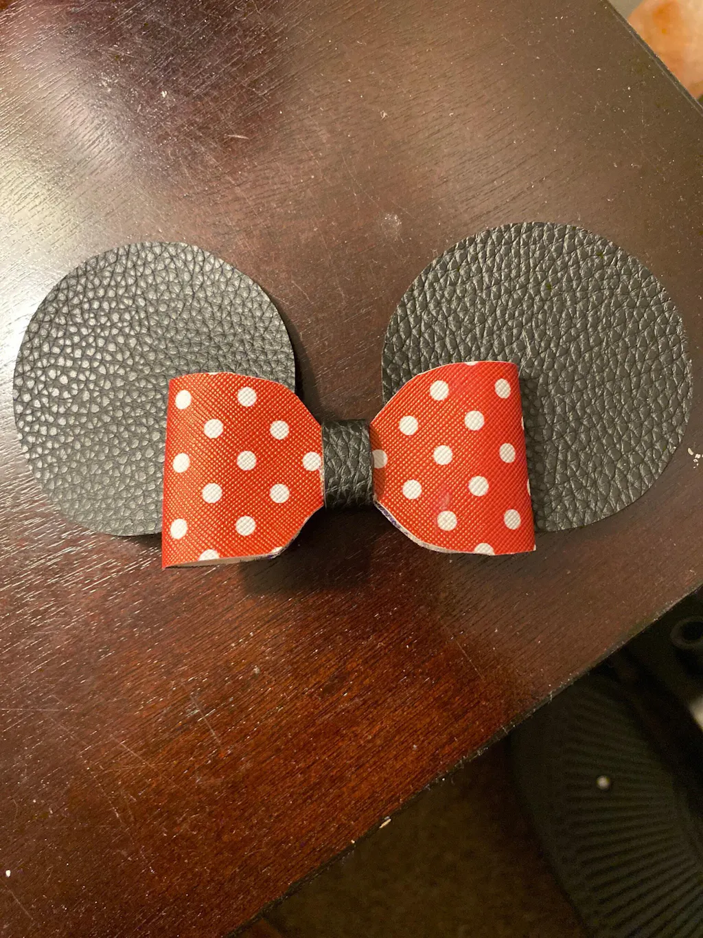 Minnie Pinch Bow - This pretty plump pinch bow looks great in red and white polka dots and with just a subtle peep of mouse ears behind.